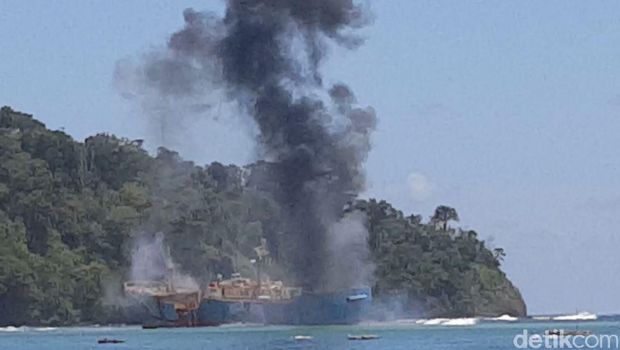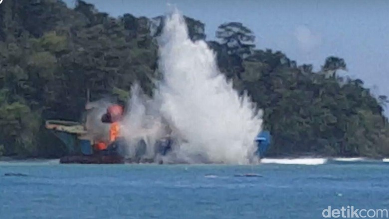Foto: Dok Kementerian Kelautan dan PerikananPeledakan kapal berlangsung sekitar pukul 12.30 WIB, Senin (14/3/2016). Selain Susi, acara ini juga disaksikan oleh Kalakhar Laksadya Ari Sembiring, Bupati Pangandaran Jeje Wiradinata, dan koordinator Satgas 115 Mas Achmad Santosa. Kapal tersebut ditenggelamkan setengah. Sebagian bodinya akan dipertontonkan sebagai monumen pemberantasan illegal fishing.