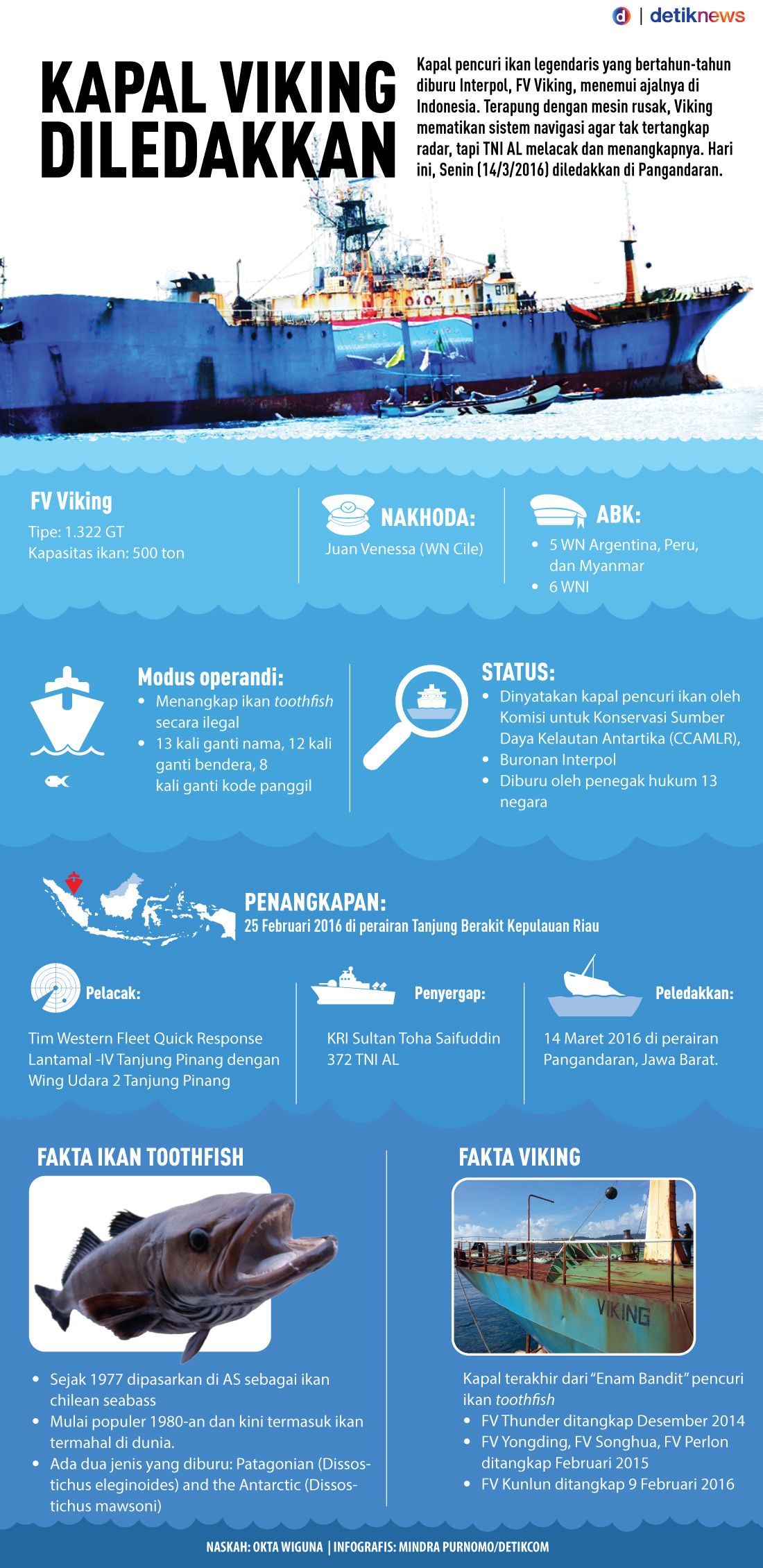 Dalam pernyataannya, Susi menjelaskan kapal FV Viking yang berukuran 1.322 GT merupakan kapal tanpa kebangsaan yang telah usang melaksanakan acara penangkapan ikan secara ilegal di banyak sekali belahan dunia. Oleh Regional Fisheries Management Organization (RFMO) Samudera Antartika Selatan berjulukan Commission for the Conservation of Antarctic Marine Living Resources (CCAMLR), kapal ini dikategorikan sebagai kapal pelaku illegal fishing.