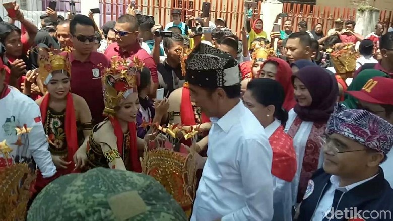 Jokowi datang di Taman Blambangan Banyuwangi sekira pukul 10.20 WIB, Senin (25/3/2019). Relawan dan simpatisan Capres nomer urut 01 ini lalu di sambut oleh ratusan penari gandrung. Tak hanya itu, Jokowi pribadi diberikan ikat kepala khas Banyuwangi (Udeng) oleh Bupati Banyuwangi Abdullah Azwar Anas.