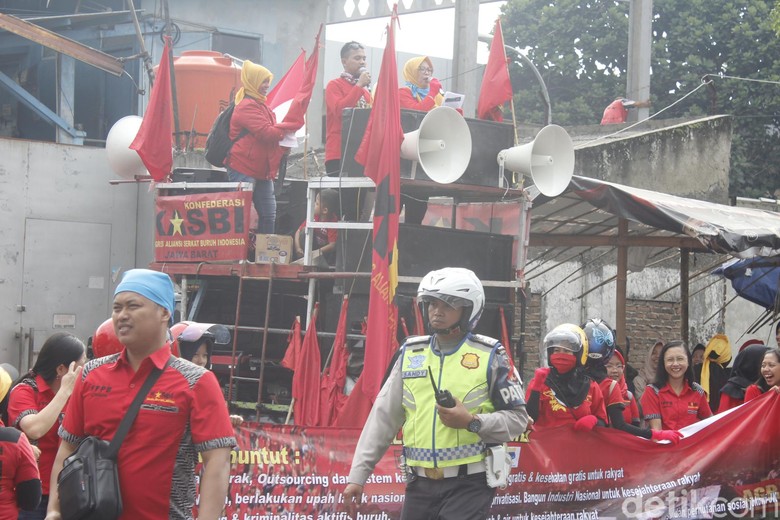 Foto: Yudha MaulanaCimahi -Ratusan buruh dari Kongres Aliansi Serikat Buruh Indonesia (KASBI) Kota Cimahi berorasi di depan PT Kahatex, Jalan Gempolsari, Bandung Kulon, Kota Cimahi pada peringatan Hari Buruh atau May Day, Rabu (1/5/2019).