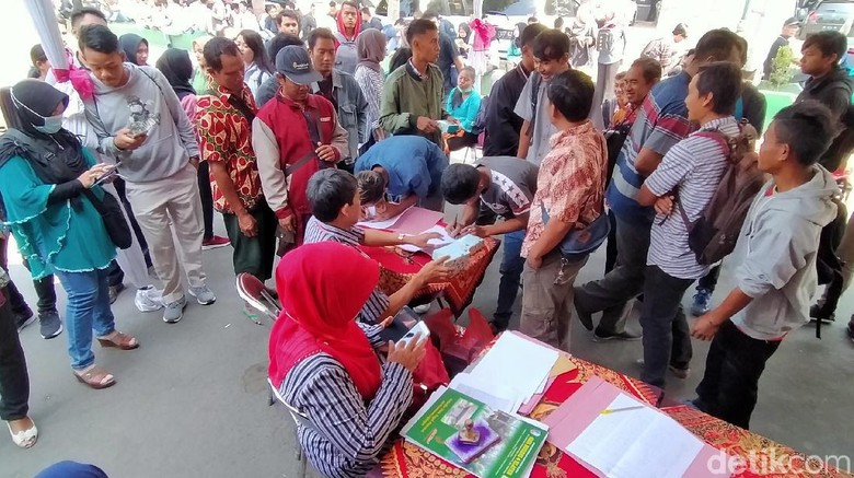 Para pencari kerja di Klaten Job Fair 2019 di GOR Geralsena, 29 Oktober 2019. Foto: Achmad Syauqi/detikcomKlaten -Serikat Pekerja Seluruh Indonesia (SPSI) Kabupaten Klaten mendapatkan anjuran besaran upah minimum kabupaten (UMK) Klaten tahun 2020 Rp 1.947.821,16. Namun SPSI menawarkan dua catatan untuk Pemkab Klaten.